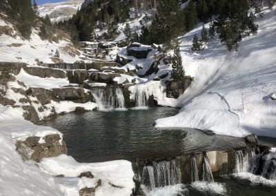 The next day we drove around to the Valle de Aragon north of Jaca and crosse through the Somport tunnel into France. The views onto the north faces of the Aspe peaks covered in ice and snow were absolutely fantastic. They just got better as we climbed up through beech woods before breaking out into the open valley that leads up to the Ibon de Estanes (which is actually back on the Spanish side of the border!). The large lake was completely frozen over and the big kids amongst us just had to take a walk across it!